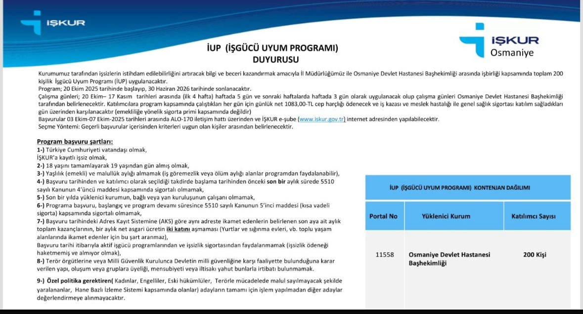 Osmaniye Merkez’de ikamet eden vatandaşlar için önemli bir istihdam fırsatı doğdu. Osmaniye Devlet Hastanesi bünyesinde görevlendirilmek üzere İŞKUR’un İşe Uyum Programı (İUP) kapsamında 200 kişilik kontenjan açıldı. Program, 20 Ekim 2025 – 30 Haziran 2026 tarihleri arasında yürütülecek.